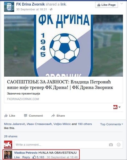 Internetová doba je neúprosná a dobehla aj Vladicu Petrovica. Ten sa o svojom vyhadzove dozvedel z facebookovej stránky tímu, ktorý trénoval. Bosnianska liga všeobecne nebola najmilšia k trénerom - Petrovic sa stal už 10. vyhodeným trénerom v sezóne. V danej chvíli však zachoval pokojnú hlavu a preukázal nutne veľkú dávku humoru, pretože na svoj vyhadzov odpovedal tiež priamo na facebookovej stránke.